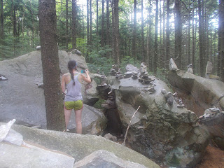 Around lunchtime, or our first of many anyway, we came to a clearing in the woods near the White Rocks Cliff trail junction. Previous hikers--or aliens--had stacked rocks in all manners and designs. Treetops still obscured the pallid sky, but they were spaced apart, and all were of the needlecraft. Evergreens. Ever fragrant. Ever attractive. The scent was a case of Olfactory Overload, but it was the sight that stole our attention. Stolen or not, it was something to behold, a rocky Zen garden in what appeared to be a sculpted forest. The forest was au naturel; only the rocks had been sculpted, scripted, conscripted.
